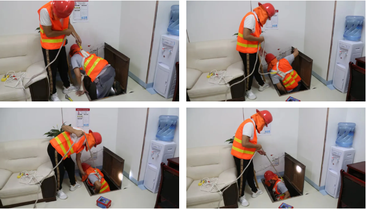 培训过后,总务科又组织保安、后勤人员等进行有限空间应急演练。