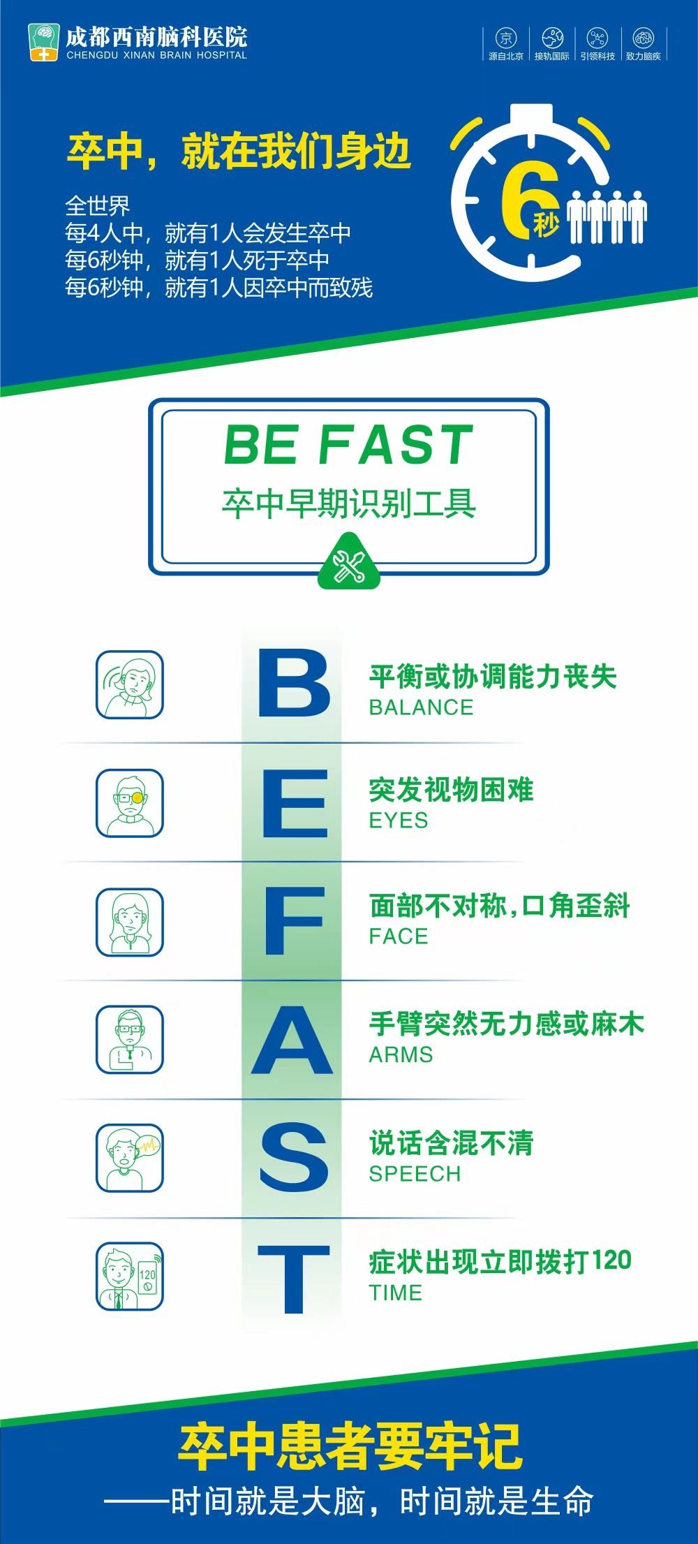 一旦出现上述任何一项症状,患者及家属应立即拨打120急救电话,尽快将患者送到有救治能力的医院。目前,多数医院都已建立了脑卒中救治绿色通道,可以对脑卒中患者进行有效救治。