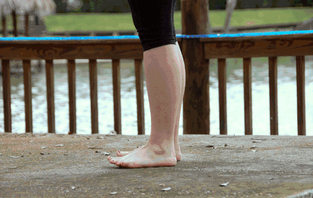 脚趾撑住地面,慢慢踮起脚跟到极限,然后停顿三秒钟,最后,做自由落体运动,让脚跟轻撞地面,引发柔和的震荡,沿两腿上传到上半身。